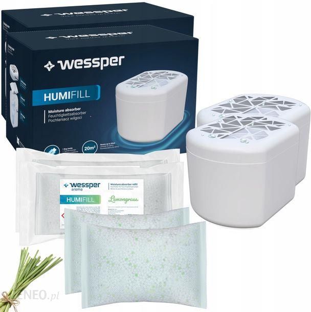 2x POCHŁANIACZ WILGOCI + WKŁAD TRAWA CYTRYNOWAProducent: WessperWaga: 700gRodzaj: OryginałIlość sztuk: 2 zestawy (pochłaniacz + wkład)Opakowanie: FolioweRodzaj pochłaniacza: wkład do pochłaniaczaPOCHŁANIACZ WILGOCI HUMIFILLPochłaniacz wilgoci Wessper jest bardzo intuicyjny w obsłudze. Zaczyna działać w chwili umieszczenia wkładu w urządzeniu. Produkt jest ekologiczny – nie wymaga użycia prądu ani baterii.Ze względu na swój nowoczesny wygląd nie będzie szpecił naszych pomieszczeń, a dodatkowo może pełnić funkcję estetyczną. Urządzenie posiada dużą powierzchnię kontaktu granulek pochłaniacza z powietrzem – przez to wydajność automatycznie się zwiększa.POCHŁANIACZ WILGOCI HUMIFILLPochłaniacz idealnie sprawdzi się zarówno w domowych warunkach, jak i w miejscu pracy.Zmniejsza wilgotność powietrza i zapobiega rozwojowi pleśni, grzybów, stęchlizny, korozji oraz zaparowaniu szyb.Pochłaniacz Wessper zadba nie tylko o stan Twojego mieszkania, ale także o Twoje zdrowie. Prawidłowa wilgotność powietrza jest niezwykle istotna dla naszego samopoczucia.WKŁAD DO POCHŁANIACZA WILGOCI WESSPER HUMIFILL 250G – TRAWA CYTRYNOWA – 2 SZTUKIWkład uniwersalny przeznaczony do wszystkich pochłaniaczy wilgoci dostępnych na rynku. Działa skutecznie w pomieszczeniach do 20m2przez3 miesiące od rozpakowania.Dzięki swojej uniwersalności, wkład pasuje do większości pochłaniaczy wilgoci dostępnych na rynku m.in. do pochłaniacza Wessper HumiFill.Działa natychmiastowo!Działa skutecznie! Reguluje poziom wilgotności w pomieszczeniach i przez to zapobiega:korozjirozwojowi pleśni i grzybówzaparowaniu szybzapachowi stęchliznySprzyja zachowaniu komfortowych warunków w pomieszczeniach, co pozytywnie wpływa na zdrowie.WKŁAD DO POCHŁANIACZA WILGOCI WESSPER HUMIFILL 250G – ZAPACH TRAWY CYTRYNOWEJSposób użycia wkładu do pochłaniacza wilgoci:ustaw pochłaniacz w wybranym pomieszczeniu z dala od źródła ciepłazdejmij górną osłonę pochłaniaczaotwórz foliowe opakowanie z wkładem i umieść go w urządzeniu (unikaj bezpośredniego kontaktu ze skórą)stopniowo granulki będą ulegać stopieniu, a powstała ciecz zgromadzi się w pojemniku poniżejkiedy granulki całkowicie się rozpuszczą, otwórz górną pokrywę pochłaniacza i wylej powstały płyn do sedesu. Nie należy wykorzystywać go do innych celów np. podlewania roślinWKŁAD DO POCHŁANIACZA WILGOCI WESSPER HUMIFILL 250G – ZAPACH TRAWY CYTRYNOWEJWkład posiada dyskretny, ale wyczuwalnyzapach trawy cytrynowej! Jest on wypełniony granulatem, który został stworzony na bazie olejkóweterycznych, czyli z całkowicie naturalnych substancji czynnych, pochodzących z określonych części roślin!