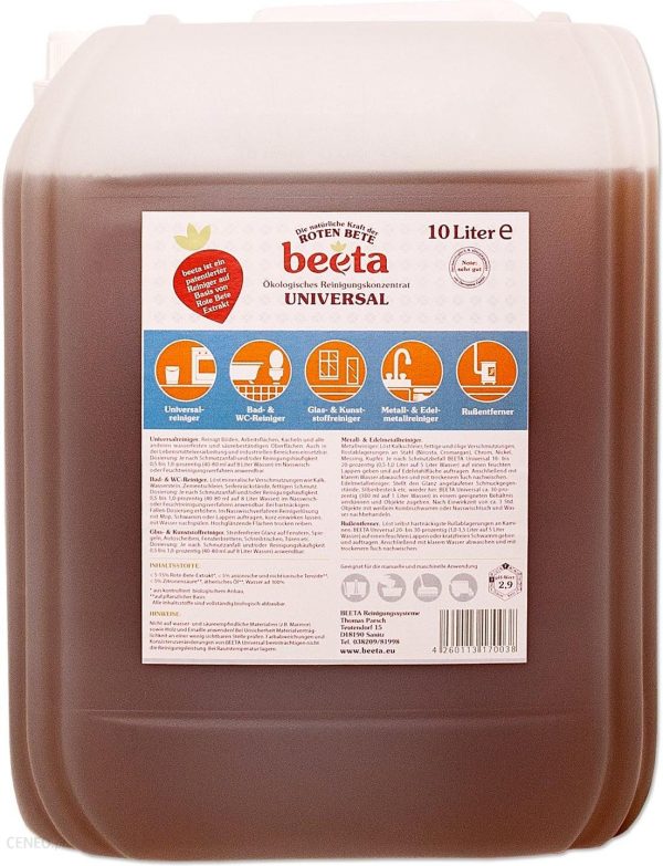 5 w 1, prawdziwy talent Uniwersalny koncentrat do czyszczenia Uniwersalny koncentrat do czyszczenia od Beeta jest prawdziwym talentem. Ten koncentrat oferuje 5 razy silniejszą mocy i skuteczność czyszczącą w jednym produkcie. Cechy: Uniwersalny środek do czyszczenia Ekologiczny i uniwersalny Do użytku w domowego i przemysłowego Wysoko wydajny Posiada dobre dermatologiczne i alergologiczne właściwości Zastosowanie: Uniwersalny środek do czyszczenia: podłóg wykonanych z parkietu, PCC, linoleum, płytek i wszelkiego rodzaju powierzchni roboczych. 1 do 2% – towy roztwór w wodzie, lub 10 do 20 % – towy roztwór gotowy do użycia w butelce rozpylającej. Środek do czyszczenia łazienki: 2-3% – towy roztwór w wodzie, lub w czystej formie na bardzo brudnych powierzchniach. 20 do 30% – towy gotowy do użycia roztwór w butelce rozpylającej Środek do czyszczenia szkła i tworzyw sztucznych: 1-2% – towy roztwór w wodzie. 10 do 20 % – towy gotowy do użycia roztwór w butelce rozpylającej Środek do czyszczenia metalu: 1-2% – towy roztwór w wodzie. 20 do 30% towy gotowy do użycia roztwór w butelce rozpylającej Środek do usuwania sadzy: 1-2% – towy roztwór w wodzie, w czystej formie na bardzo brudnych powierzchniach. 20 do 30% – towy gotowy do użycia roztwór w butelce rozpylającej