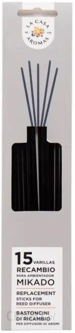 LA CASA DE LOS AROMAS Patyczki do olejków zapachowych ZAPAS CZARNE, 15 sztPatyczki zostały wykonane z tworzywa, które chłonie olejek zapachowy, następnie patyczki powoli uwalniają zapach.Przy pomocy ilości patyczków umieszczonych w flakonie z olejkiem można zwiększyć lub zmniejszyć intensywność zapachu wystarczy umieścić w olejku odpowiednią ilość patyczków. Im jest ich mniej, tym zapach jest bardziej subtelny.Producent zaleca jednorazowe użycie 5 sztuk patyczków.Sposób użycia: Zdejmij nakrętkę z butelki ze swoim ulubionym olejkiem zapachowym. Włóż nowe patyczki do pojemnika, aby wchłonęły zapach. Odwróć patyczki do góry nogami, aby zwiększyć intensywność zapachu.Zanurzone w olejku patyczki spełniają swoją funkcję nawet do trzech tygodni. Po tym czasie warto je wymienić.Długość patyczków: 20,5 cm
