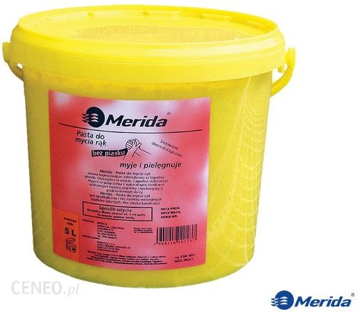 Pasta do mycia rąk MERIDA wiadro 5 litrówPasta przeznaczona do mycia silnie zabrudzonych rąk.Opakowanie zawiera 5 l preparatu.Pasta do czyszczenia rąk z powodzeniem usuwa wszelkie zabrudzenia, chroniąc jednocześnie skórę i zapobiegając podrażnieniom.Informacje dodatkowe: Opakowanie: 5 l preparatuPreparat niealkaliczny, nie zawiera mineralnych środków ściernych Produkt testowany dermatologicznie Środkiem ściernym jest mączka drzewna Sposób użycia: nanosić bezpośrednio z opakowania na mokre ręceKolor – żółtyKonsystencja – pastaZapach – świeży cytrynowy z melisąWartość pH w produkcie – ca. 6,5Gęstość – 0,84 g/ml