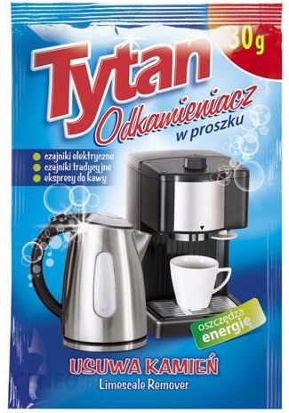 Odkamieniacz w proszku Tytan skutecznie usuwa osad z kamienia z urzadzeń drobnego AGD. Preparat przeznaczony jest do urzadzeń takich jak: czajniki tradycyjne, elektryczne, ekspresy. Dzięki regularnemu stosowaniu można przedłużyc żywotność sprzętów i ograniczyć zużycie energii elektrycznej. Nie stosować do urządzeń aluminiowych oraz żelazek.Sposób użycia:Ekspresy: Jeżeli producent sprzętu nie wskaże inaczej należy zawartość opakowania rozpuścic w 500 ml wody i całość wlać do zbiornika urzadzenia. Następnie właczyć ekspres i poczekać aż cały roztwór spłynie do przygotowanego naczynia. Nastepnie wlać do zbiornika wyłącznie czystą wodę i dwukrotnie właczyć urządzenie w celu wypłukania. W przypadku dużej ilości osadu operacje należy powtórzyć.Czajniki: Zawartość opakowania rozpuścić w 500 ml wody i całość wlać do zbiornika urządzenia. Zostawić na 15-20 minut. Następnie dokładnie wypłukać urządzenie czystą wodą. W przypadku dużej ilości osadu operacje należy powtórzyć.