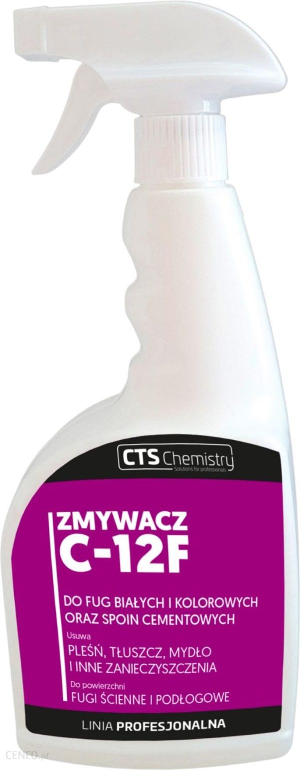 Zmywacz C-12F – to zasadowy, intensywny środek do czyszczenia fug białych i kolorowych oraz spoin cementowych ściennych i podłogowych.Skutecznie usuwa wszelkie zabrudzenia organiczne pochodzenia tłuszczowego, po mydle, środkach czyszczących i kosmetykach.Obszar zastosowań:Można stosować go na wszelkich fugach w płytkach ceramicznych, klinkierze, granicie, marmurze, trawertynie, cegle, konglomeratach kamiennych.Czyści szybko i skutecznie.Nie zawiera kwasów.Lekko pieniący.Sposób użycia:Z uwagi na różnorodność materiałową i chemiczną powierzchni poddawanych czyszczeniu, należy przed przystąpieniem do czyszczenia wykonać próbę w mało widocznym miejscu, aby sprawdzić czy nie dochodzi do niepożądanej reakcji np. przebarwienia.Preparat nanosimy na spoinę spryskiwaczem na około 3 min. Po tym czasie szorujemy delikatnie szczoteczką lub szorstką gąbką, a następnie spłukujemy czystą wodą i pozostawiamy do wyschnięcia.W przypadku wystąpienia silnych zagrzybień i pleśni na fugach silikonowych, preparat należy nanieść na około 20 minut. Po tym czasie szorujemy delikatnie szczoteczką lub szorstką gąbką i czekamy jeszcze około 10 minut. Ponownie delikatnie szorujemy szczoteczką lub szorstką gąbką.Następnie spłukujemy czystą wodą i pozostawiamy do wyschnięcia.W przypadku nieuzyskania zadowalającego efektu, czynności należy powtórzyć.Uwagi i zalecenia:Preparat jest w formie gotowej do zastosowania. Nie rozcieńczać.Należy stosować ogólne zasady bezpieczeństwa zgodnie z kartą charakterystyki.Przed czyszczeniem należy zaopatrzyć się w środki bhp: okulary i rękawice ochronne.Nie dopuszcza się kontaktu Zmywacza C-12F z materiałami nie odpornymi na działanie zasad.Drażniący skórę i oczy. Dłuższy kontakt z preparatem może spowodować uszkodzenie oczu/skóry.Chronić przed dziećmi.Produkt zawiera:Alkohole, C12–15, etoksylowane, propan-2-ol, wodorotlenek sodu.Dane techniczne:wodny, bezbarwny roztwórgęstość ok. 1 kg/dm3pH ok. 11,5zapach charakterystyczny dla detergentówOpakowanie: butelka 750 ml ze spryskiwaczem